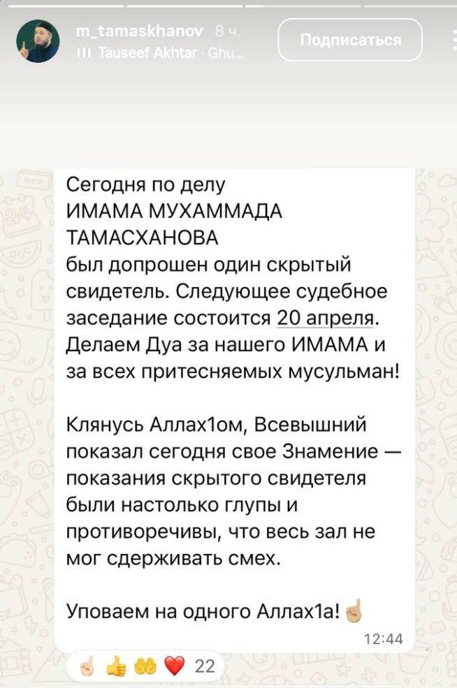 Материалы по делу Тамасханова поступили в суд в декабре 2025 года. Судебное заседание переносили дважды: в феврале 2026-го — по инициативе судьи, из-за «невозможности заслушать свидетелей в связи с техническими проблемами», и в марте — по просьбе защиты Тамасханова, поскольку в Рамадан имам вместе с прихожанами выстаивает ночные молитвы и каждый вечер читает проповеди.