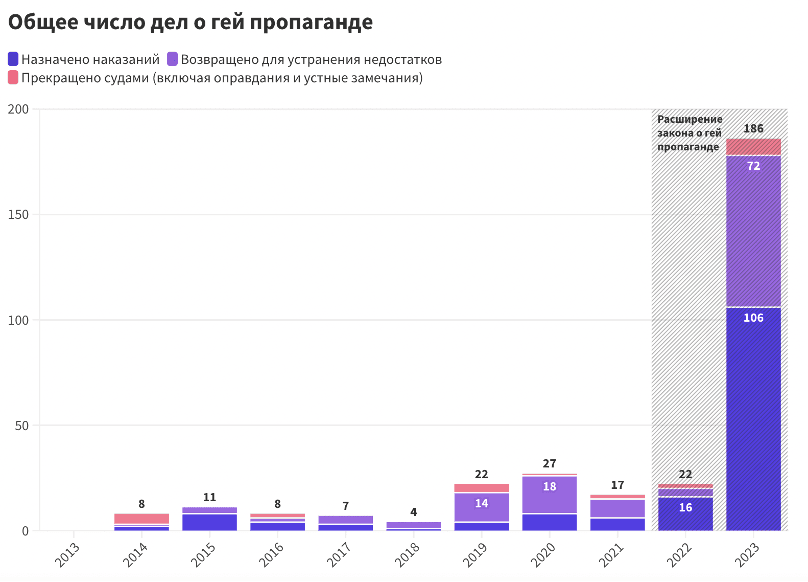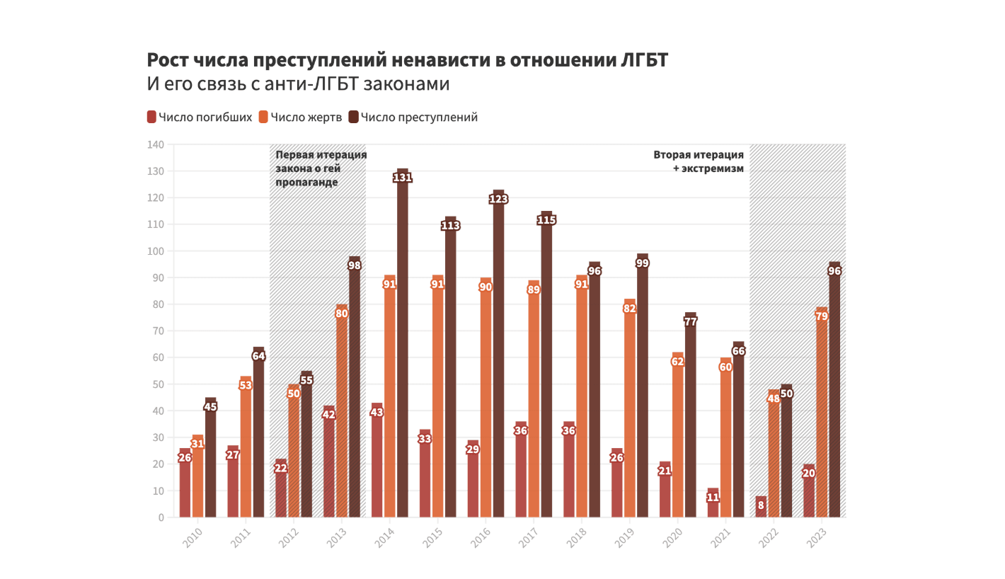 Если первый рост (2013–2020) можно связать с законом о «гей-пропаганде», то говорить о том, что вторую вспышку в 2023 году вызвали новые анти-ЛГБТ нормы, пока рано. Необходимо больше данных (без данных за 2024 год эту гипотезу невозможно подтвердить).