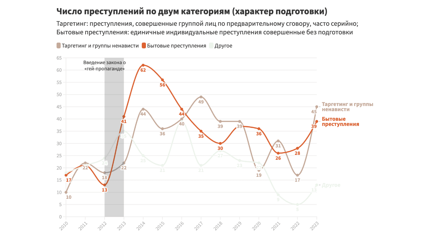 С помощью баз данных судебных решений удалось выявить более 1200 таких правонарушений, совершенных с 2010 по 2023 годы, а также два всплеска преступности: в 2014 году после вступления в силу закона о запрете «гей-пропаганды» и в 2023 году после расширения действия этого закона (декабрь 2022 года) и решения об экстремистском статусе ЛГБТ-сообщества (ноябрь 2023 года). В статистику попали ограбления, убийства, уничтожение имущества и другие преступления.