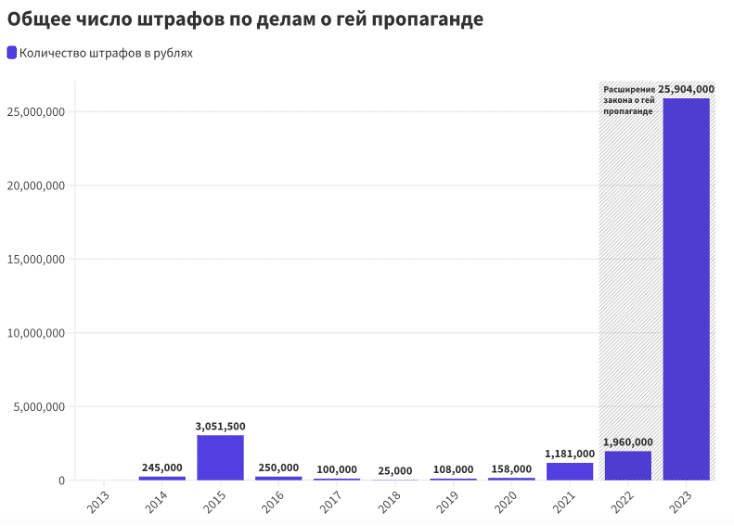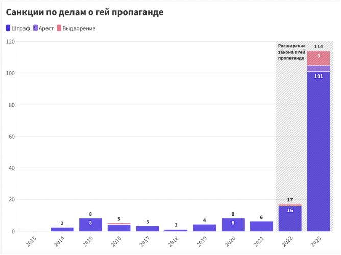Последовательная кампания по ограничению прав ЛГБТ-сообщества, которую российские власти ведут в последние годы, провоцирует рост дискриминации и насилия в отношении этой социальной группы. Два важных этапа кампании — появление в 2013 году закона о запрете «гей-пропаганды» и решение Верховного Суда РФ 2023 года об экстремистском статусе ЛГБТ-сообщества. Расплывчатость формулировок позволяет властям применять их произвольно и мешает последовательному правовому регулированию. «Гей-пропагандой» считается любое нейтральное или позитивное высказывание, хотя бы отдаленно связанное с ЛГБТ, — публикация аккаунтов на сайтах знакомств, демонстрация предметов одежды с радугой, интервью с открытым геем и т. д. С 2013 по 2023 год власти инициировали 312 дел о «гей-пропаганде», привлекли к ответственности 158 человек и организаций. В 2023 году активность властей выросла: число штрафов увеличилось в 13 раз, а их сумма достигла 26 млн рублей (для сравнения: за весь период 2013–2022 годов штрафов назначили на чуть более чем 7 млн рублей).