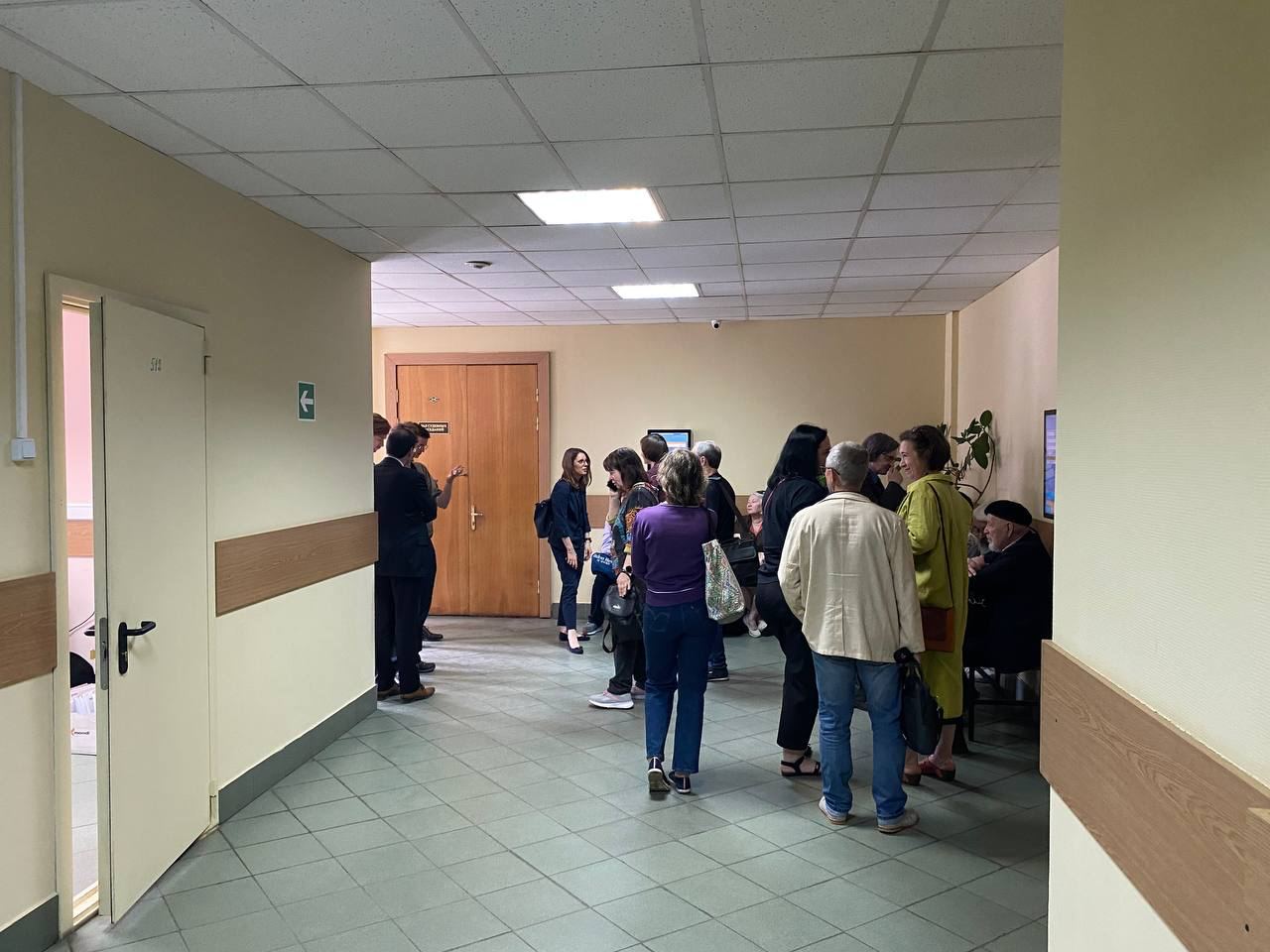 Тем временем всех, кого пустили в здание суда, но у кого нет аккредитации журналиста, отправили стоять в коридор пятого этажа.
