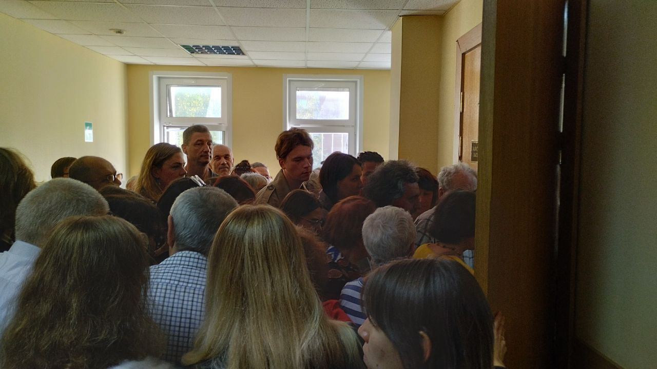 В этот раз в зале скамейки отодвинуты на расстояние друг от друга, поэтому мест меньше. Приставы перестали пускать людей, хотя еще осталось одно место.